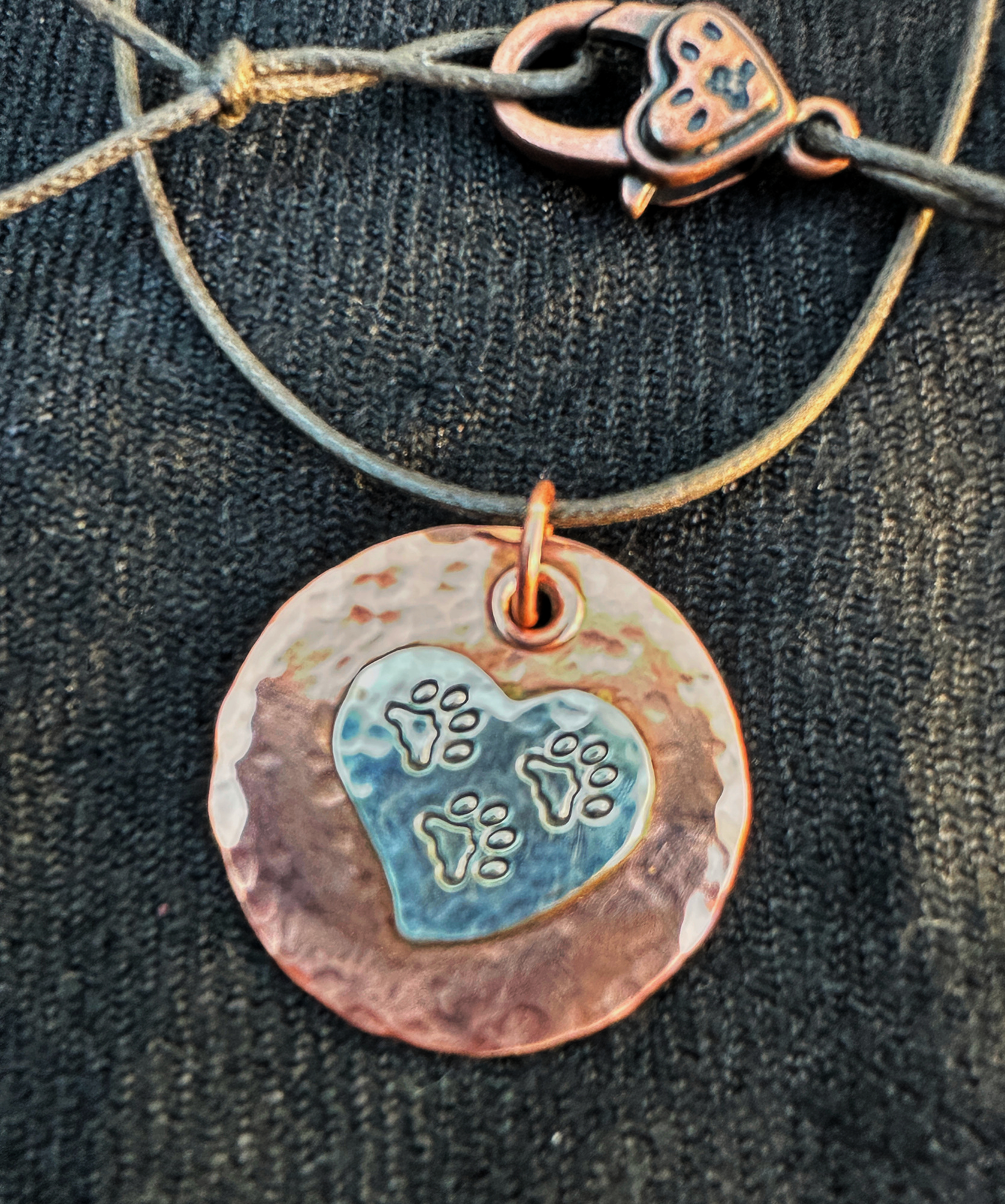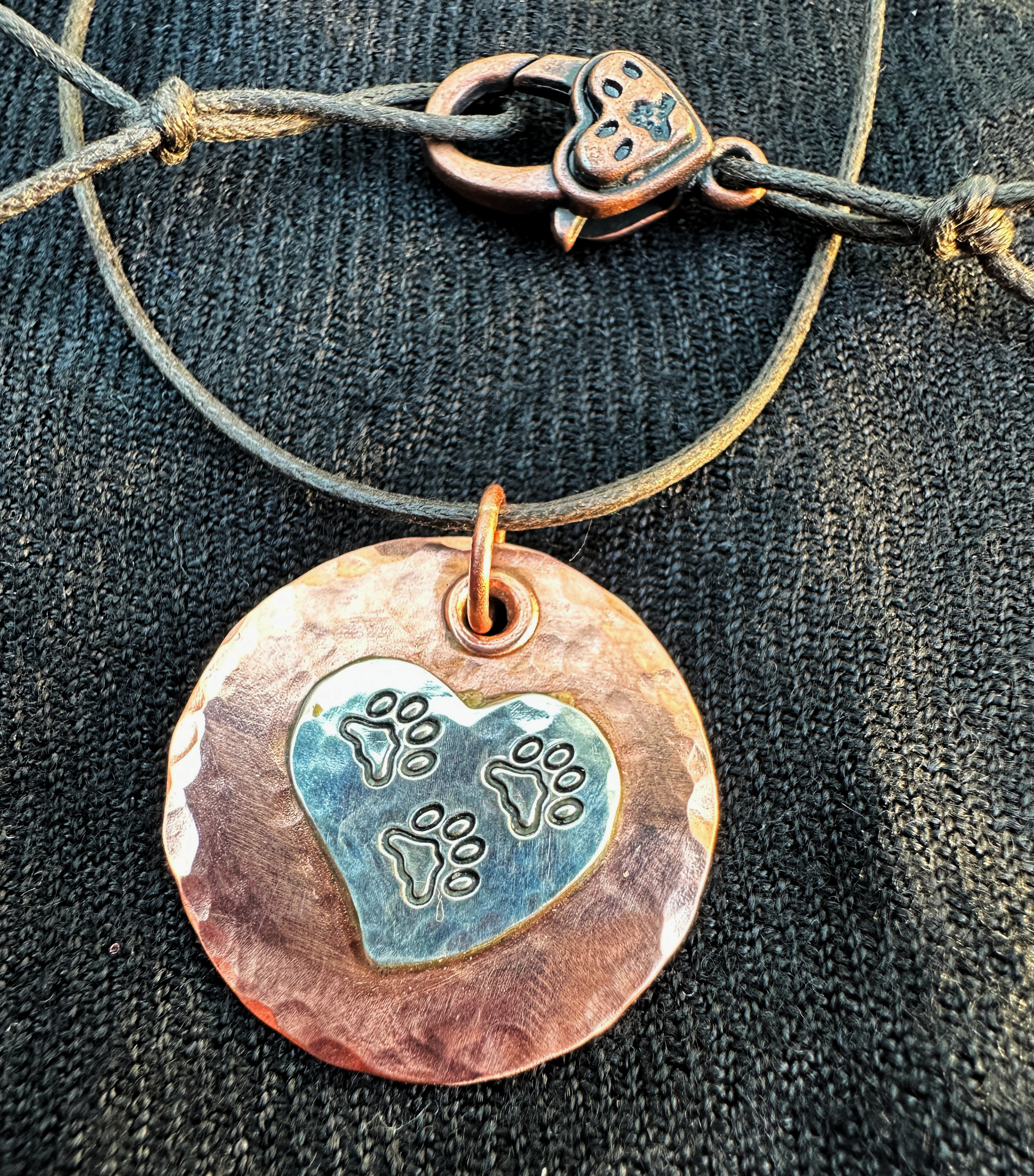Each copper pendant is 18 gauge measuring 7/8″ outside diameter. The silver paw print heart measures .5″ across. Your Tripawd necklace includes a brown necklace cord and pewter lobster clasp.